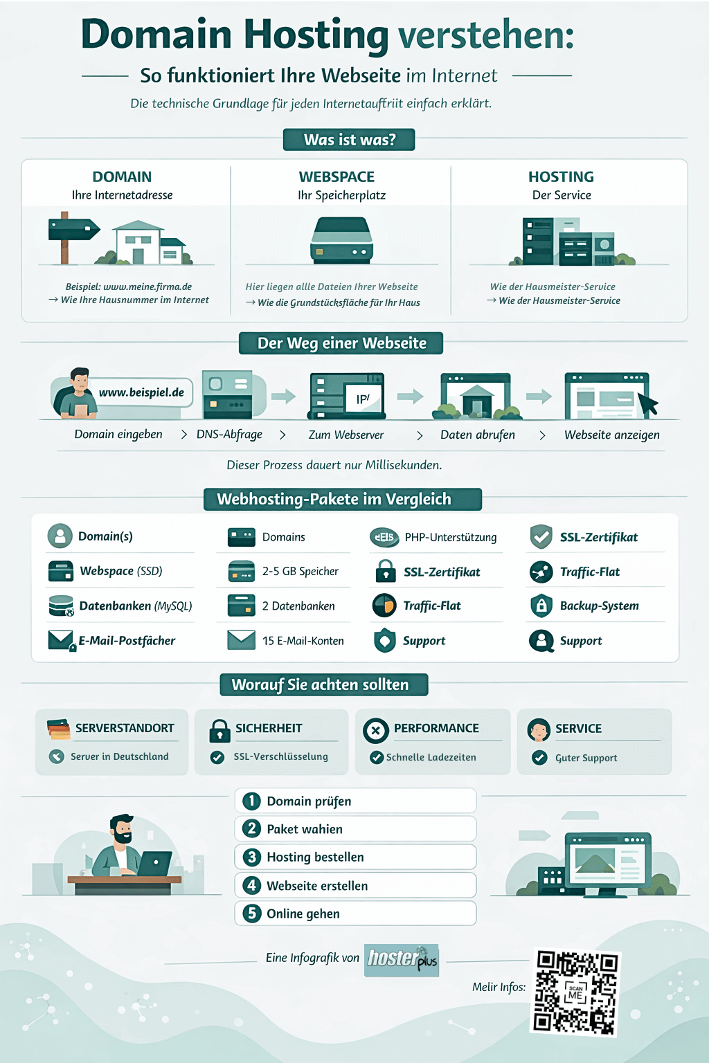 Sie suchen nach einer zuverlässigen Lösung für Ihr Domain Hosting? Dann sind Sie bei HosterPlus genau richtig. In diesem umfassenden Ratgeber erklären wir Ihnen alles Wichtige rund um das Thema Domain Hosting und zeigen Ihnen, worauf Sie bei der Wahl eines Webhosting-Anbieters achten sollten. Ob Sie eine eigene Domain für Ihr Unternehmen, einen Verein oder ein privates Webprojekt benötigen: Wir bieten Ihnen günstiges Webhosting mit professionellem Service und leistungsstarker Serverinfrastruktur in Deutschland.